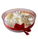 W szklanym pojemniku przewiązanym elegancką wstążką skrywa się naturalny wosk sojowy oraz dekoracje 3D, które w 100% się stapiają. Każdy element jest ręcznie malowany brokatem i shimmerem, dzięki czemu pięknie się błyszczy i połyskuje.